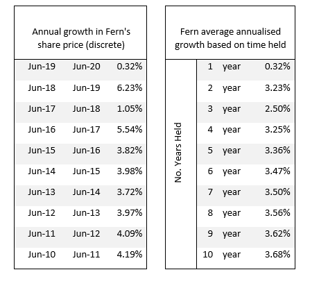 Source: Octopus Investments, 1 June 2020. The performance data table on the left of this page shows the discrete annual growth of Fern’s share price only. It does not take account of initial fees, dealing fees or annual management charges associated with investing in the Octopus Inheritance Tax Service and should not be viewed as performance information for the Octopus Inheritance Tax Service. Performance is calculated based on the sale price for Fern’s shares at 1 June each year. The performance table on the right of this page shows the average annualised growth in Fern’s share price as at 1 June 2020. For example, if you bought shares in Fern on 1 June 2016 and still held them on the 1 June 2020, then they would have grown at an average of 3.25% a year for four years. It is important to remember that the annual growth rate could have been higher or lower than the 3.25% average at certain points.