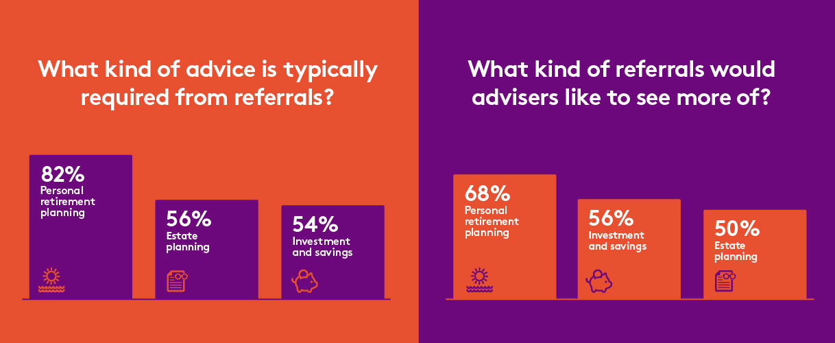 The most common type of referral work advisers receive is around personal retirement planning, followed by estate planning, and thirdly, investment and savings.