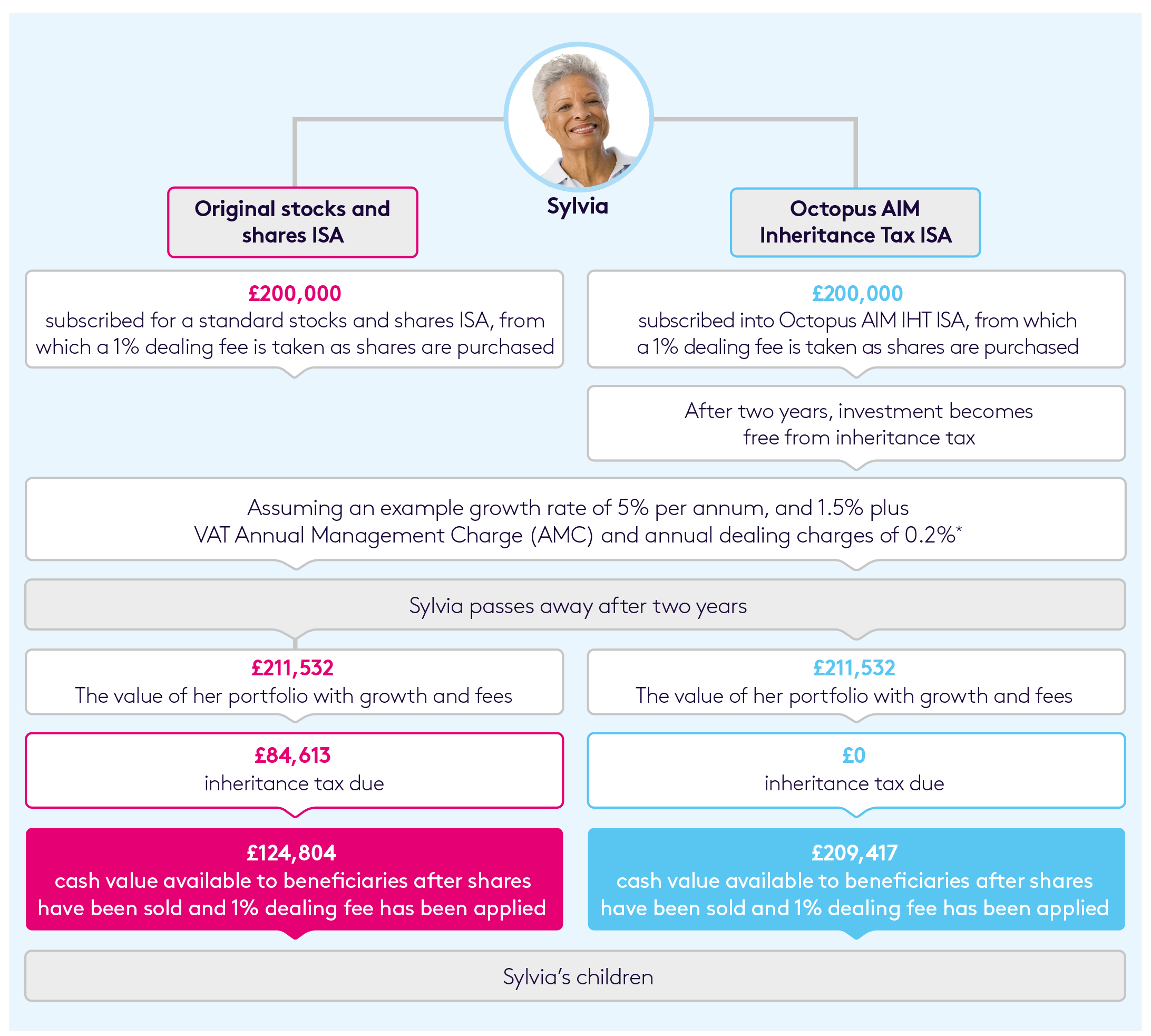 Sylvia’s adviser suggests she opens an Octopus AIM Inheritance Tax ISA that is specifically managed to invest into companies that qualify for Business Property Relief (BPR). As long as she has held the investment for at least two years when she dies, it will pass to her children free from inheritance tax. It’s worth remembering that ISAs which invest in AIM-listed companies and those which qualify for BPR are likely to have a higher risk profile than standard stocks and shares ISAs.
