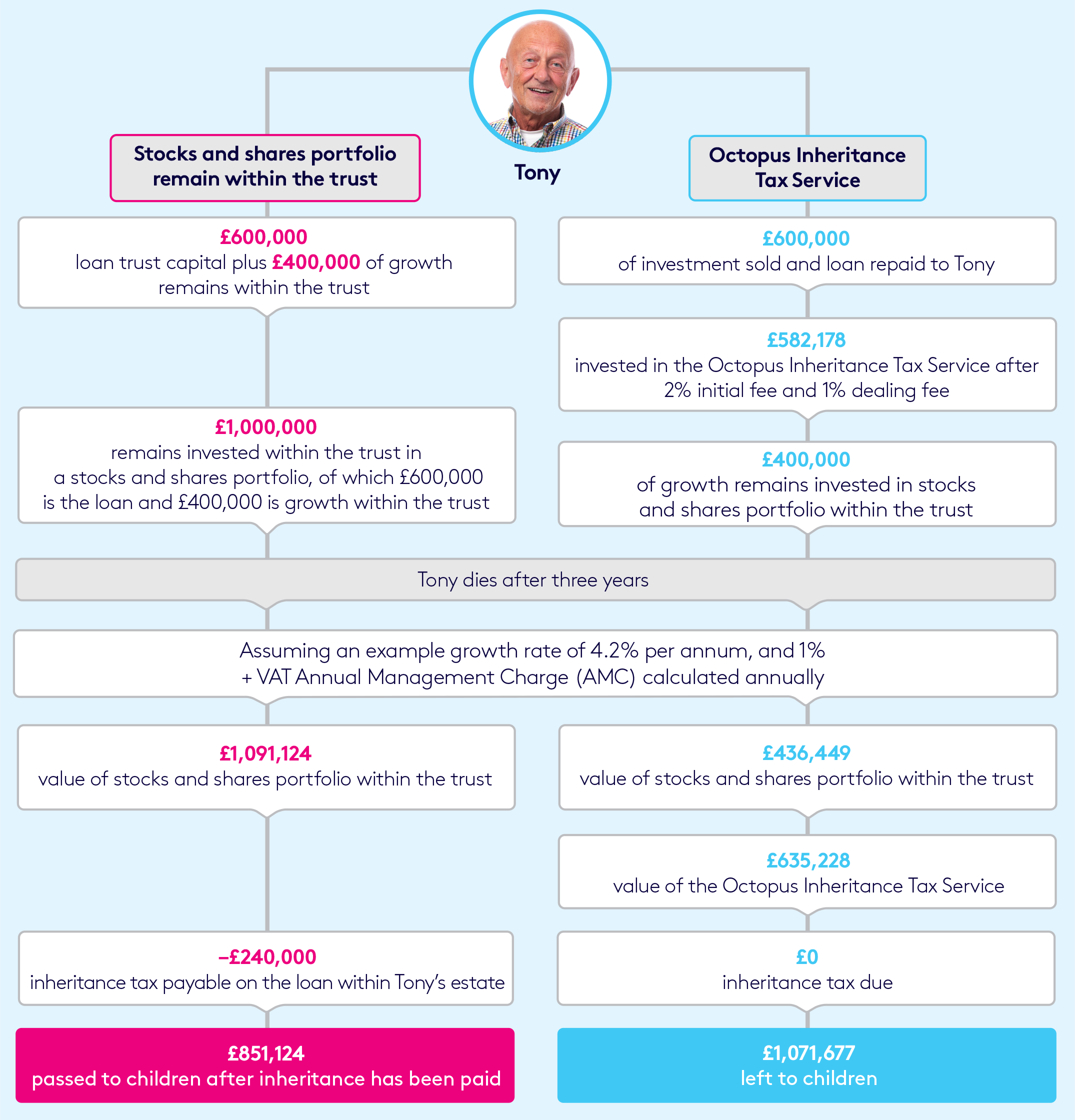 This would effectively turn the loan capital into an investment that is inheritance-tax efficient. As long as Tony has held his investment in the Octopus Inheritance Tax Service for at least two years when he dies, the shares are expected to be able to pass to his beneficiaries free from inheritance tax. The growth achieved by the loan trust would continue to be outside of Tony’s estate for inheritance tax purposes, and could itself be invested to generate further growth within the trust.